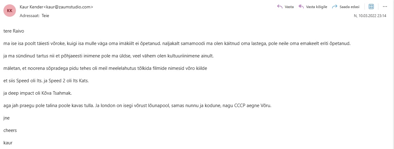 "Mul ommavaq mõnõq sõbraq, kinkaga ma ei olõq elon vast üttegi kõrda riigikeelen kõnõlnu ja noidõ sõpruga om väega lihtsa kuun ilmaasju arotaq." Padari Ivar